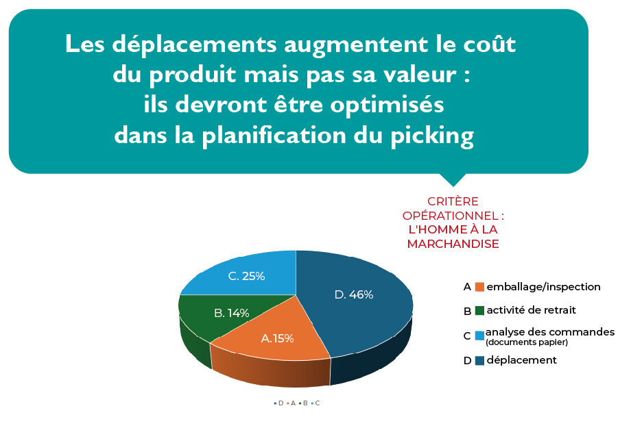 En analysant les sous-activités élémentaires du processus de picking, il apparaît évident que l’absorption des ressources attribuables aux déplacements est l’élément ayant le plus grand impact. La première approche pour améliorer l’efficacité de la configuration du picking est donc de limiter les déplacements des opérateurs.